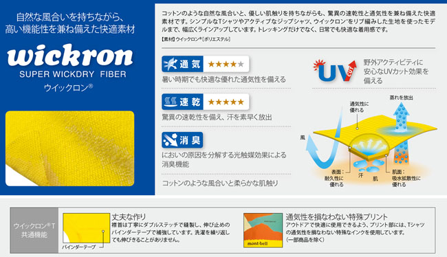 モンベルの高性能Tシャツ。ウイックロン®(ポリエステル)は、コットンのような優しい肌触りを持ちながらも、驚異の速乾性と通気性を兼ね備えた快適素材です。学会後にも、野外調査で重宝すること間違いなし!